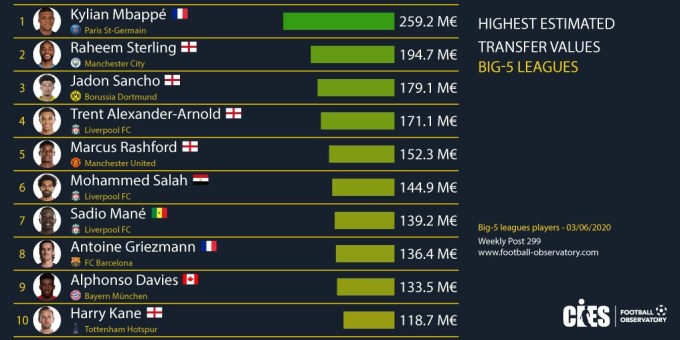 Les 10 joueurs les plus chers au monde d’après le CIES (au 8 juin 2020)